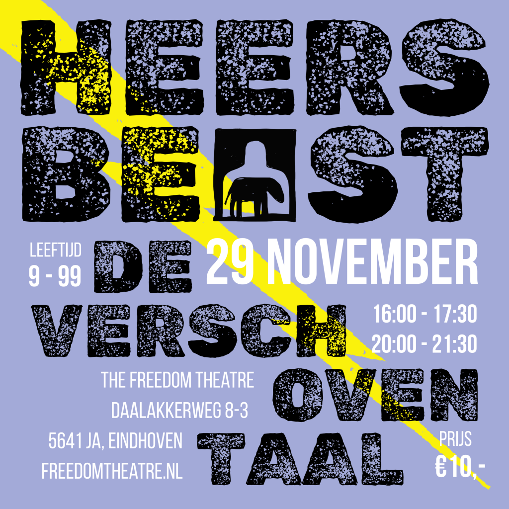 DE VERSCHOVEN TAAL is een bizar sprookje voor kinderen en volwassenen over de ongrijpbaarheid van taal. In deze muzikale en beeldende voorstelling word je meegenomen langs alle ruimtes van het Freedom Theatre in een zoektocht naar de juiste woorden. We volgen Dennis, een jongetje met een taalstoornis die zo gefrustreerd raakt over zijn versprekingen dat hij een taalverschuiving veroorzaakt in zijn dorp. Vervolgens zien we wat die verschuiving teweegbrengt bij verschillende inwoners. Met vervreemdende beelden, hilarische scènes, sferische muziek en een flinke dosis taalfilosofie tonen we de creativiteit die ontstaat wanneer de juiste woorden even kwijt zijn.